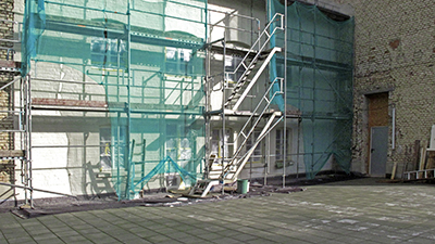 Endreinigung der Sonthofener Fußbodenplatten im Getreidelager OG. Auf der Terrasse über dem Getreidelager: Putz- und Malerarbeiten an der Fassade des Südflügels. |