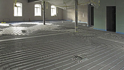 Verlegung der Fußbodenheizung im Dachgeschoss des Brauhauses. |