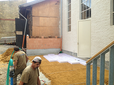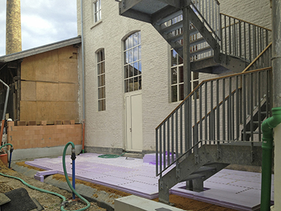 Aufbringen einer Dämmschicht über dem Kellergewölbe im Bereich zwischen Sudhaus und Brauhaus. |