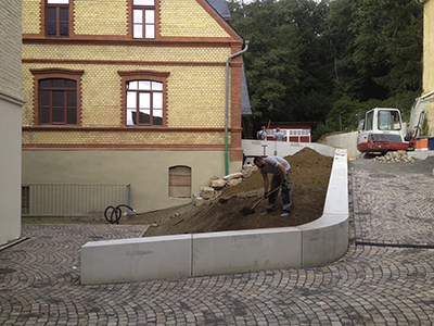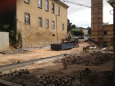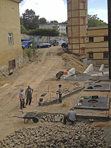 Pflanzmulden für Bäume und Anlage der Parkplatzmarkierungen. |