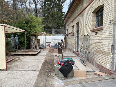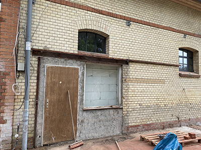 08.03.2021 Westfassade des Pferdestalls mit temporär entferntem Schiebetor. |