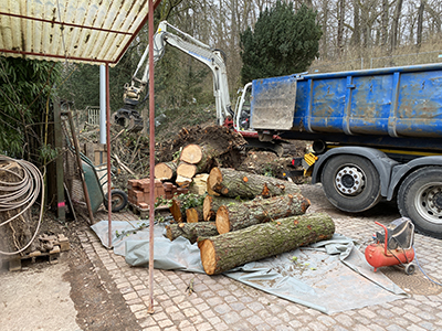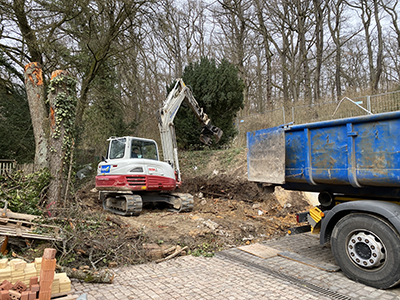 Wo bis vor ein paar Tagen noch eine große Erle stand: Beseitigung des Wurzelstocks und Planierung der Fläche für künftige Parkplätze. |