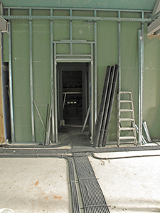 Im Treppenhaus selbst wird derweil eine erste Putzschicht aufgetragen, bevor die Geschossdecke später entfernt wird. Noch führen die Türen aus Malzhaus (links) und Südflügel (rechts) teilweise ins "Nichts". | ||