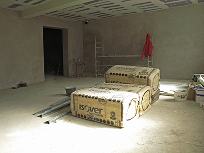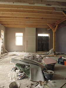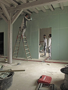 Malzhaus Obergeschoss: Trockenbauarbeiten und das neue Fenster jetzt mit Gläsern versehen. |
