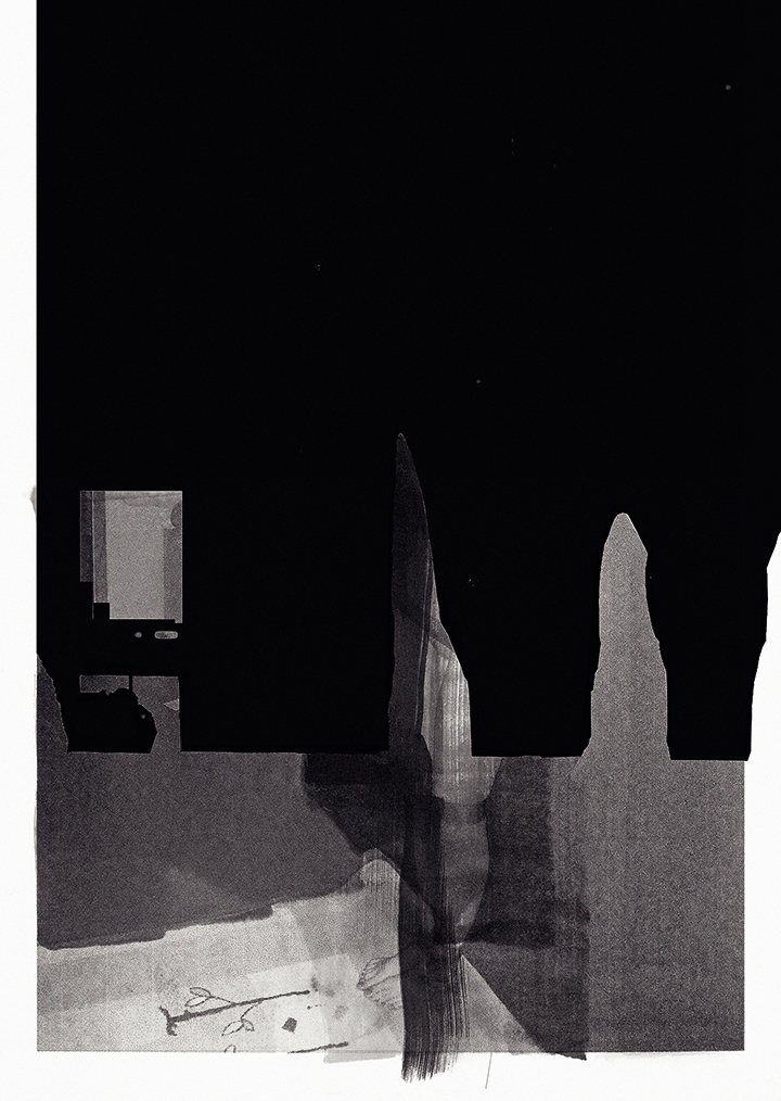 | »Soot/Ruß« aus der Serie »Verloren/Lost«, 2022 Digitaldruck und Acryl auf Synthetikgewebe, ca. 223 x 160 cm |