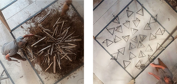 Der Klangkünstler Will Menter bespielt seine aus vier Pyramidenstrukturen und Naturmaterialien bestehende Klanginstallation Inhabitation. Bildrechte an den Fotos: Will Menter.